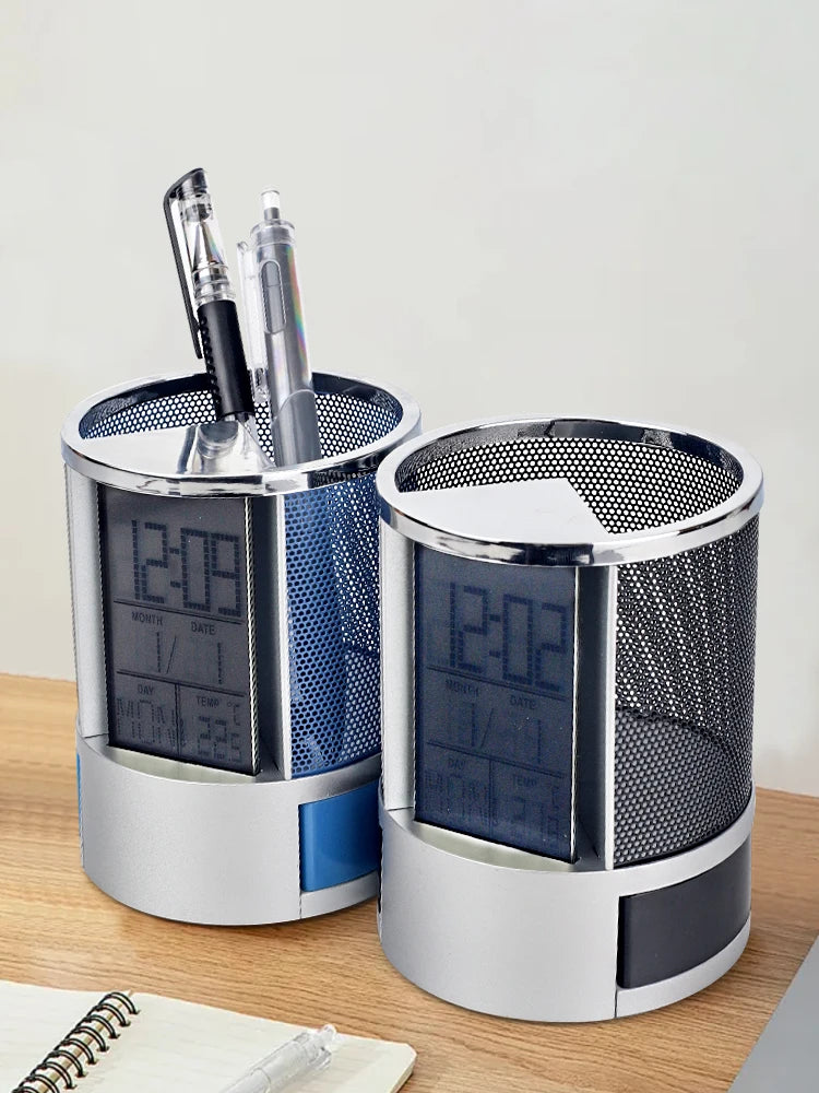 Iron mesh circular perpetual calendar storage pen holder - clock alarm clock - temperature detection multi-function